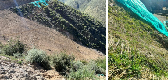 2022年5月,西藏山南贡嘎普夏石灰岩矿山上山道路下边坡恢复治理项目工程总面积为11万平方米,其中上边坡面积25000平方米,下边坡面积85000平方米,下边坡坡度基本在65—75°,上边坡坡度基本75°左右,局部80°,局部区域带有反坡,项目施工区最高海拔5100m。本项目芷兰生态在实施过程中,坚持生态修复、遵循自然、美化矿区、因地制宜、技术可行、经济合理、功能优化、综合治理、效益统一等原则。针对不同类型的坡面,采用不同的实施形式。