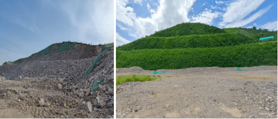项目位于云南元江县永发水泥有限公司,边坡坡度约45~65°,局部坡段坡度超过65°的高陡边坡,坡积物、强风化层剥离和开挖形成的边坡,坡面局部存松散滑动层,恢复难度较大。通过采用肥力锚点双网工艺,结合当地的乡土植物组配,实现了90%以上的覆盖度以及后期免维护。