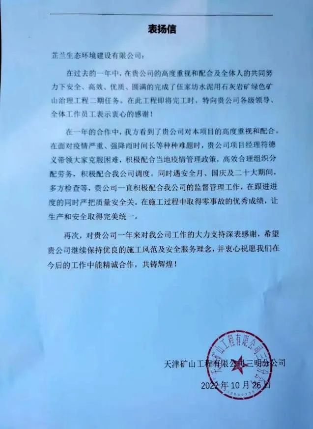 2022年,芷兰生态在浙江桐庐县桐君街道阆苑村,复绿矿区最终边坡120-145米边坡、20个平台复绿、80-120米边坡复绿。中建材旗下天津矿山工程有限公司对项目的成果给予了表扬信,这表明该项目在改善地质环境和生态环境方面取得了显著成就。