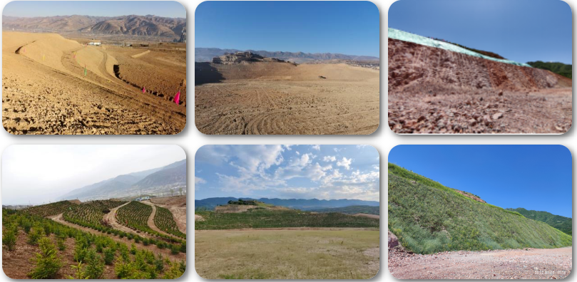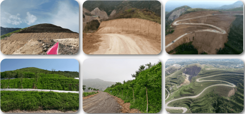 项目位于河北省九州市井陉县,南北矿山涉及修复治理的总面积为55.62万m2,治理范围分为5大类。充分利用周边废石渣土、底泥滤饼等固体废弃物填充堆体表面缝隙,采用微生物、有机物和先锋植物综合措施等改良路径,以重建植被生长所需的土壤层。