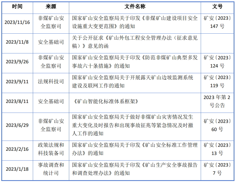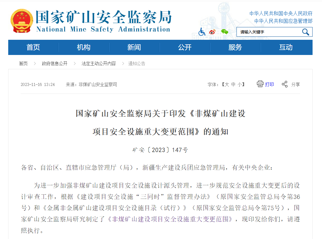 日前,国家矿山安全监察局关于印发《非煤矿山建设项目安全设施重大变更范围》的通知给各省、自治区、直辖市应急管理厅(局),新疆生产建设兵团应急管理局,有关中央企业。