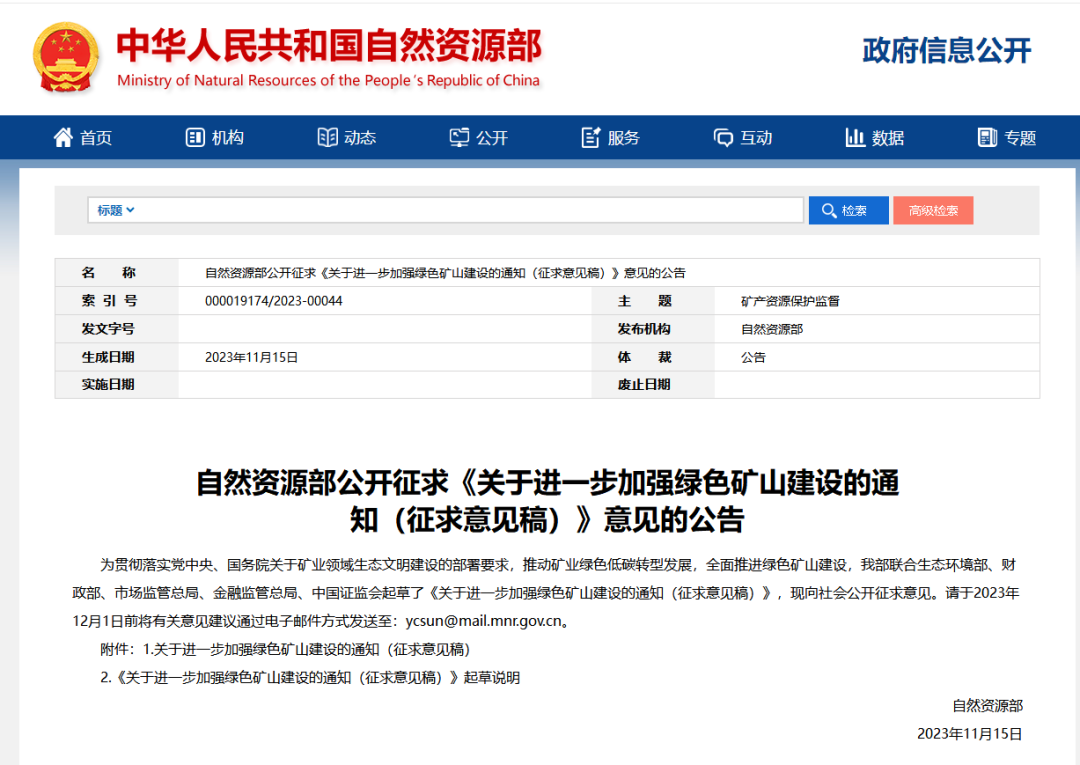同期,自然资源部发布自然资源部公开征求《关于进一步加强绿色矿山建设的通知(征求意见稿)》意见的公告。