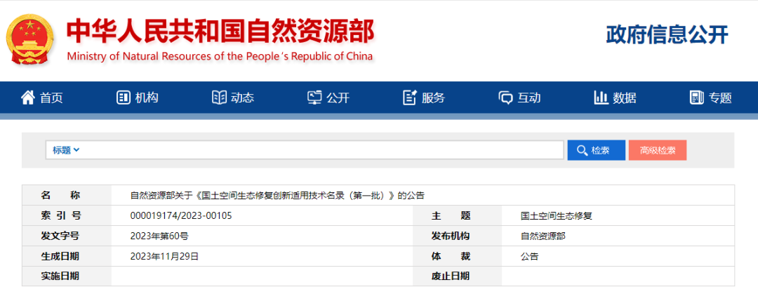 12月4日,《国土空间生态修复创新适用技术名录(第一批)》在浙江安吉召开的首届自然资源与生态文明论坛上发布。涉及山水林田湖草沙一体化生态保护修复等7个领域的31项技术入选。