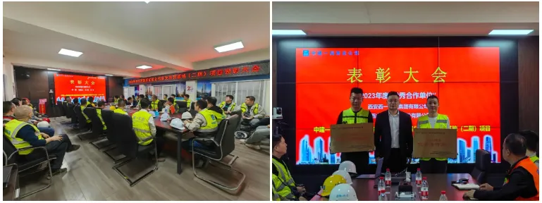 为总结经验、表彰先进,项目部专门召开2023年项目建设总结表彰大会,对表现突出的合作单位和建设个人进行表彰,2家分包合作单位、5名工友、4名管理人员获得荣誉。
