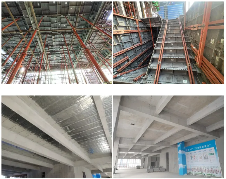 项目创新性铝模快拆体系全楼整体性应用,即从负三层地下室到二十三层结构全部使用铝模。一举打破传统标准层才用铝模的模式。通过多次深化模拟测算,该应用,不仅极大节省工期,同时大大减少塔吊压力,且混凝土成型质量好,具有免修补打磨、不产生建筑垃圾、工完场清、节能减碳等优点,助力碳中和。也为铝模应用创造出新的模式,为建筑行业提出新的绿色智慧建造方案。
