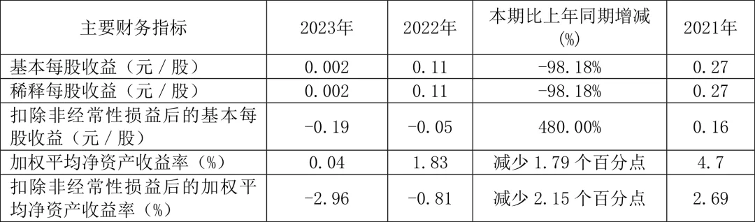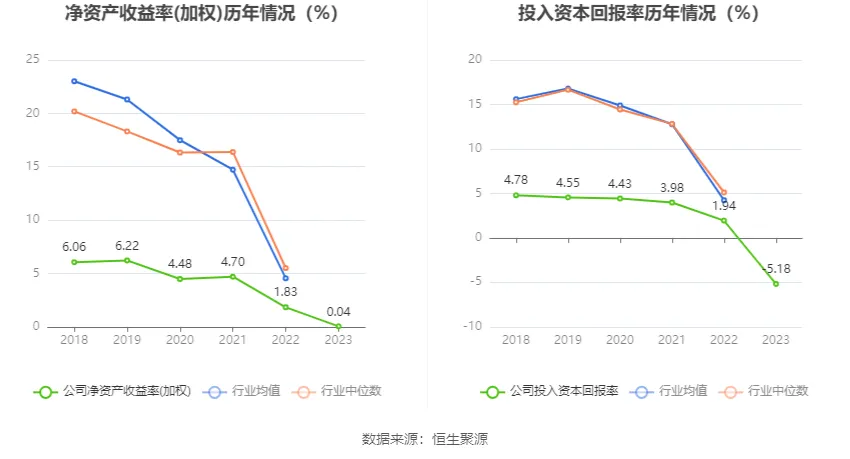 数据显示,2023年公司加权平均净资产收益率为0.04%,较上年同期下降1.79个百分点;公司2023年投入资本回报率为-5.18%,较上年同期下降7.12个百分点。