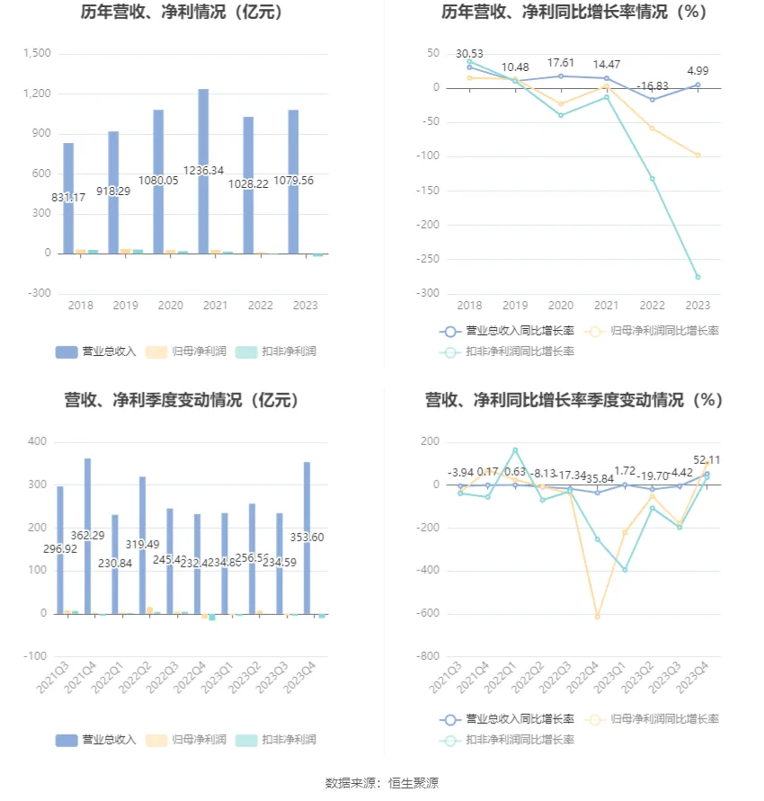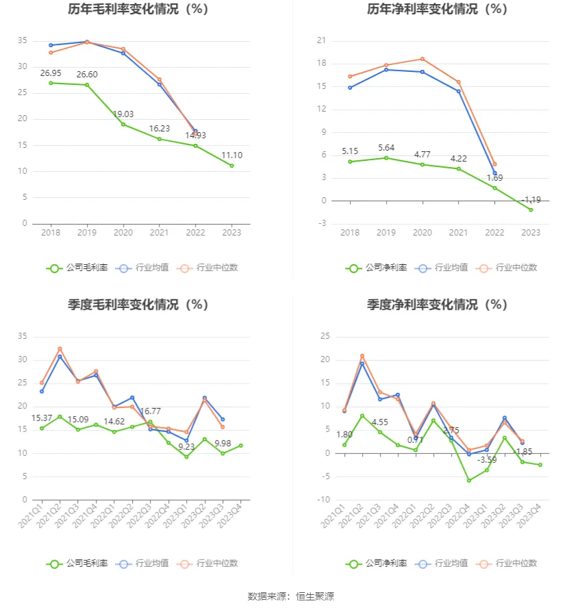 2023年,公司毛利率为11.10%,同比下降3.83个百分点;净利率为-1.19%,较上年同期下降2.88个百分点。从单季度指标来看,2023年第四季度公司毛利率为11.68%,同比下降0.60个百分点,环比上升1.70个百分点;净利率为-2.46%,较上年同期上升3.37个百分点,较上一季度下降0.61个百分点。