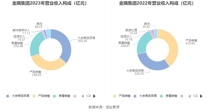 分产品来看,2023年公司主营业务中,大宗商品贸易收入392.26亿元,同比增长20.14%,占营业收入的36.34%;产品销售收入358.50亿元,同比下降12.69%,占营业收入的33.21%;房屋销售收入252.48亿元,同比增长10.41%,占营业收入的23.39%。