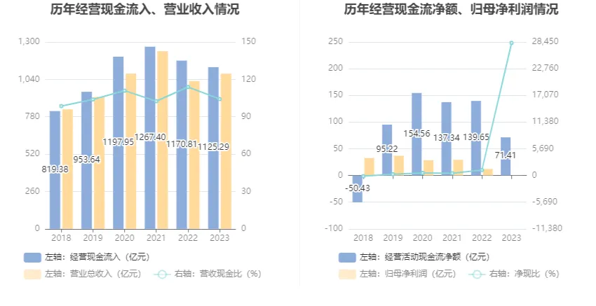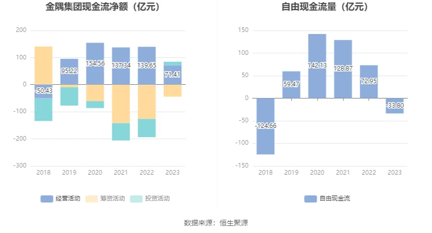 2023年,公司经营活动现金流净额为71.41亿元,同比下降48.87%;筹资活动现金流净额-44.63亿元,同比增加82.02亿元;投资活动现金流净额13.24亿元,上年同期为-67.32亿元。