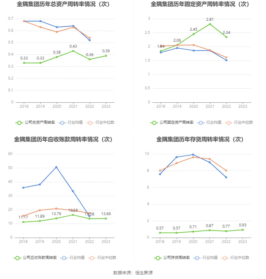 营运能力方面,2023年,公司公司总资产周转率为0.39次,上年同期为0.36次(2022年行业平均值为0.52次,公司位居同行业15/16);公司应收账款周转率、存货周转率分别为13.66次、0.93次。