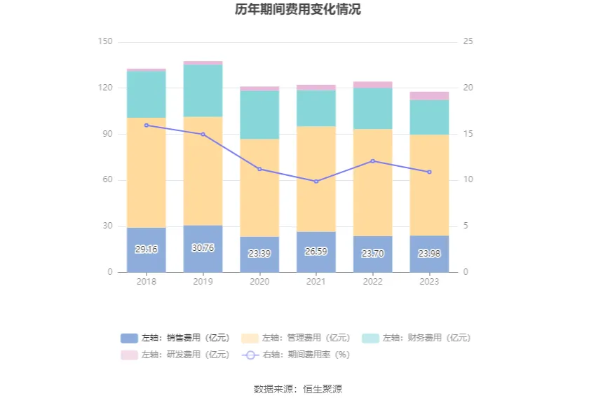 2023年,公司期间费用为117.69亿元,较上年同期减少6.57亿元;期间费用率为10.90%,较上年同期下降1.19个百分点。其中,销售费用同比增长1.18%,管理费用同比下降5.64%,研发费用同比增长29.27%,财务费用同比下降15.35%。