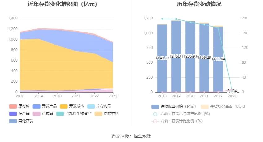 从存货变动来看,截至2023年年末,公司存货账面价值为31.34亿元,占净资产的4.29%,较上年末减少1080.5亿元。其中,存货跌价准备为2.13亿元,计提比例为6.36%。