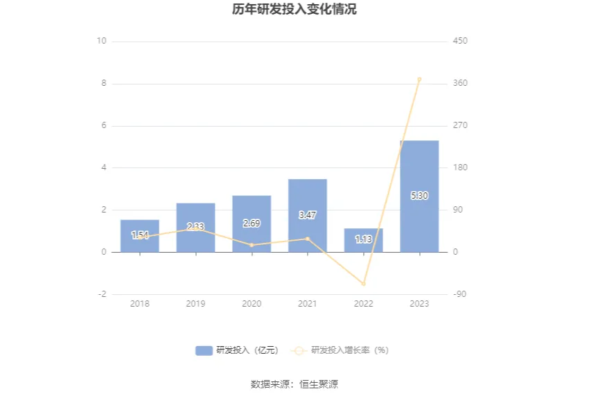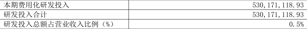 2023年全年,公司研发投入金额为5.30亿元,同比增长369.48%;研发投入占营业收入比例为0.50%,相比上年同期上升0.17个百分点。此外,公司全年研发投入资本化率为0。