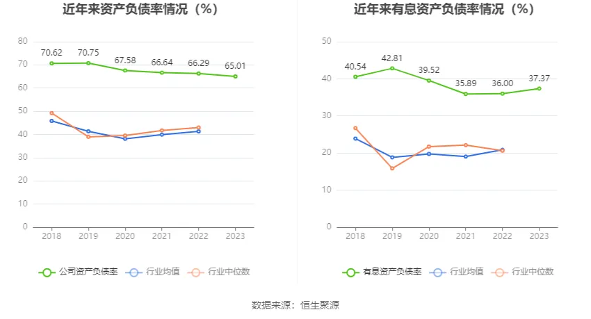 在偿债能力方面,公司2023年年末资产负债率为65.01%,相比上年末下降1.28个百分点;有息资产负债率为37.37%,相比上年末上升1.37个百分点。