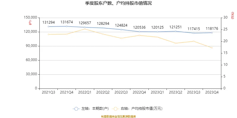 筹码集中度方面,截至2023年末,公司股东总户数为11.82万户,较三季度末增长了761户,增幅0.65%;户均持股市值由三季度末的20.01万元下降至17.26万元,降幅为13.74%。
