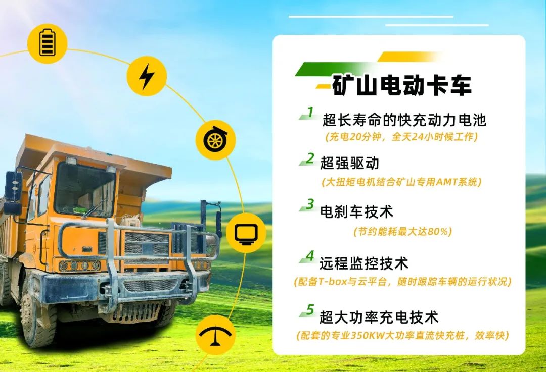 五、超大功率充电技术。配套的专业350KW大功率直流快充桩,确保矿车的运营效率。