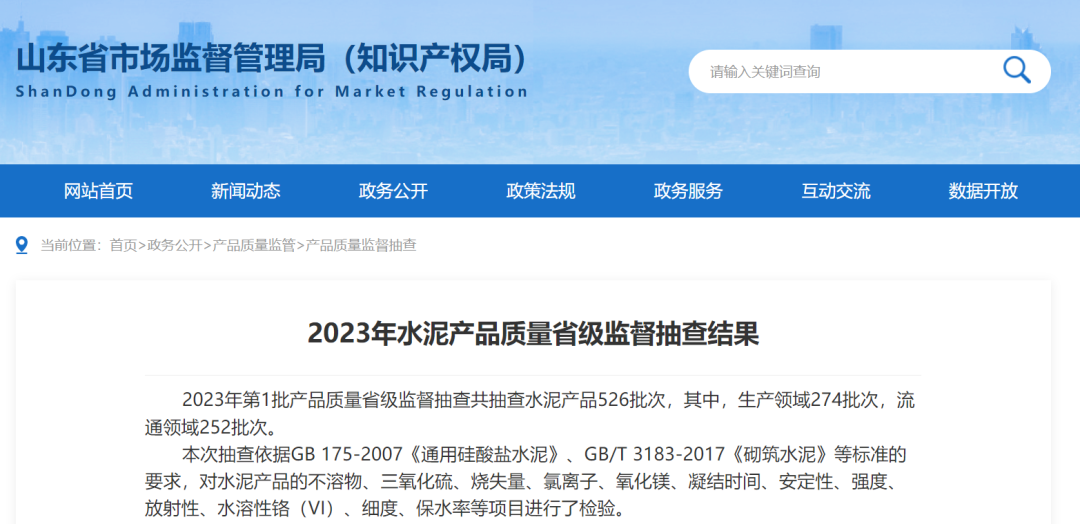 日前,山东省市场监管局公布《2023年水泥产品质量省级监督抽查结果》称,2023年第1批产品质量省级监督抽查共抽查水泥产品526批次,其中,生产领域274批次,流通领域252批次。