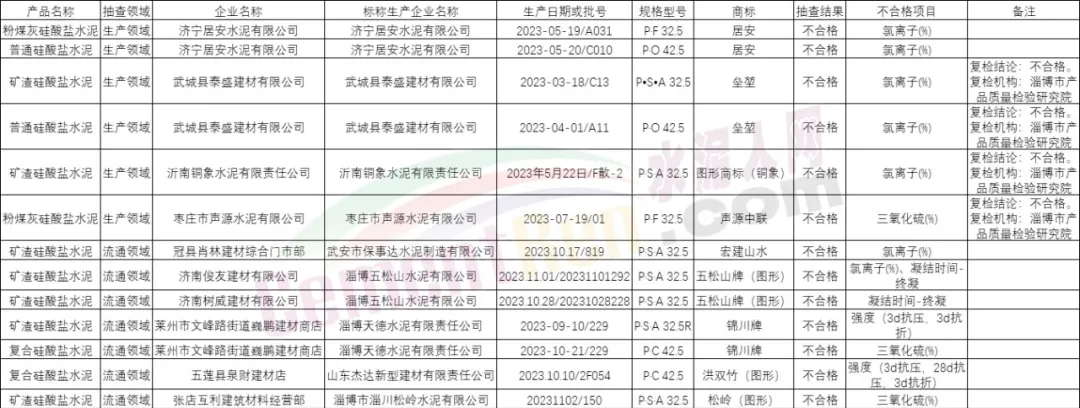 本次抽查发现济宁居安水泥有限公司、武城县泰盛建材有限公司、沂南铜象水泥有限责任公司、枣庄市声源水泥有限公司等6家生产者生产的8批次产品,以及冠县肖林建材综合门市部、济南俊友建材有限公司、济南树威建材有限公司、莱州市文峰路街道巍鹏建材商店、五莲县泉财建材店、张店互利建筑材料经营部等6家销售者销售的7批次产品不符合相关标准的要求,不合格项目为三氧化硫、氯离子、水溶性铬(Ⅵ)、凝结时间和强度。其中,武城县泰盛建材有限公司、沂南铜象水泥有限责任公司、枣庄市声源水泥有限公司对检验结果提出异议,并申请复检;经复检后,维持初检结论。