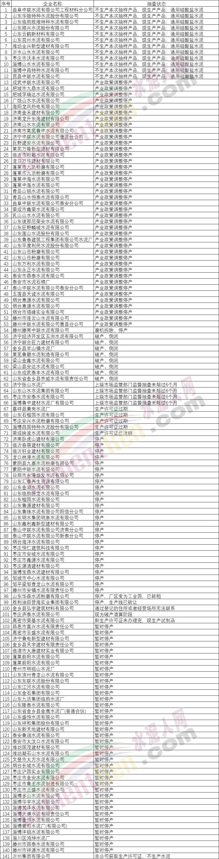 成武中联水泥有限公司、肥城市九鼎水泥有限公司、肥城孚瑞达水泥有限公司、广饶山水水泥有限公司、海阳龙凤热电有限公司、济南金禾建材有限公司等41家水泥企业,产业政策调整停产。