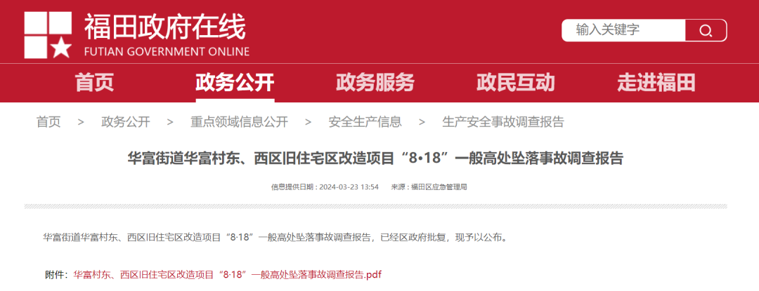 2023年8月18日,广东深圳一旧住宅区改造项目1名施工人员高处作业时,从50层屋面钢结构处坠落至地上二层平台身亡。事故发生后,现场负有安全生产管理责任的相关单位和人员,均未及时、如实上报事故。近日,该起事故调查报告公布多人已被刑事拘留。