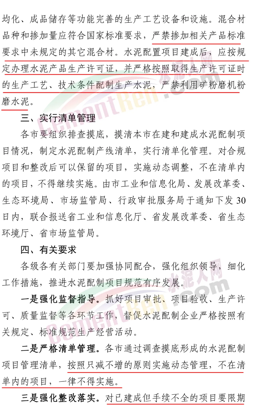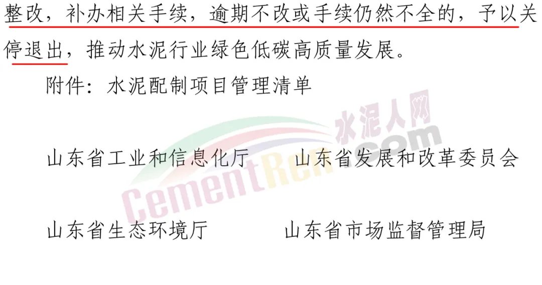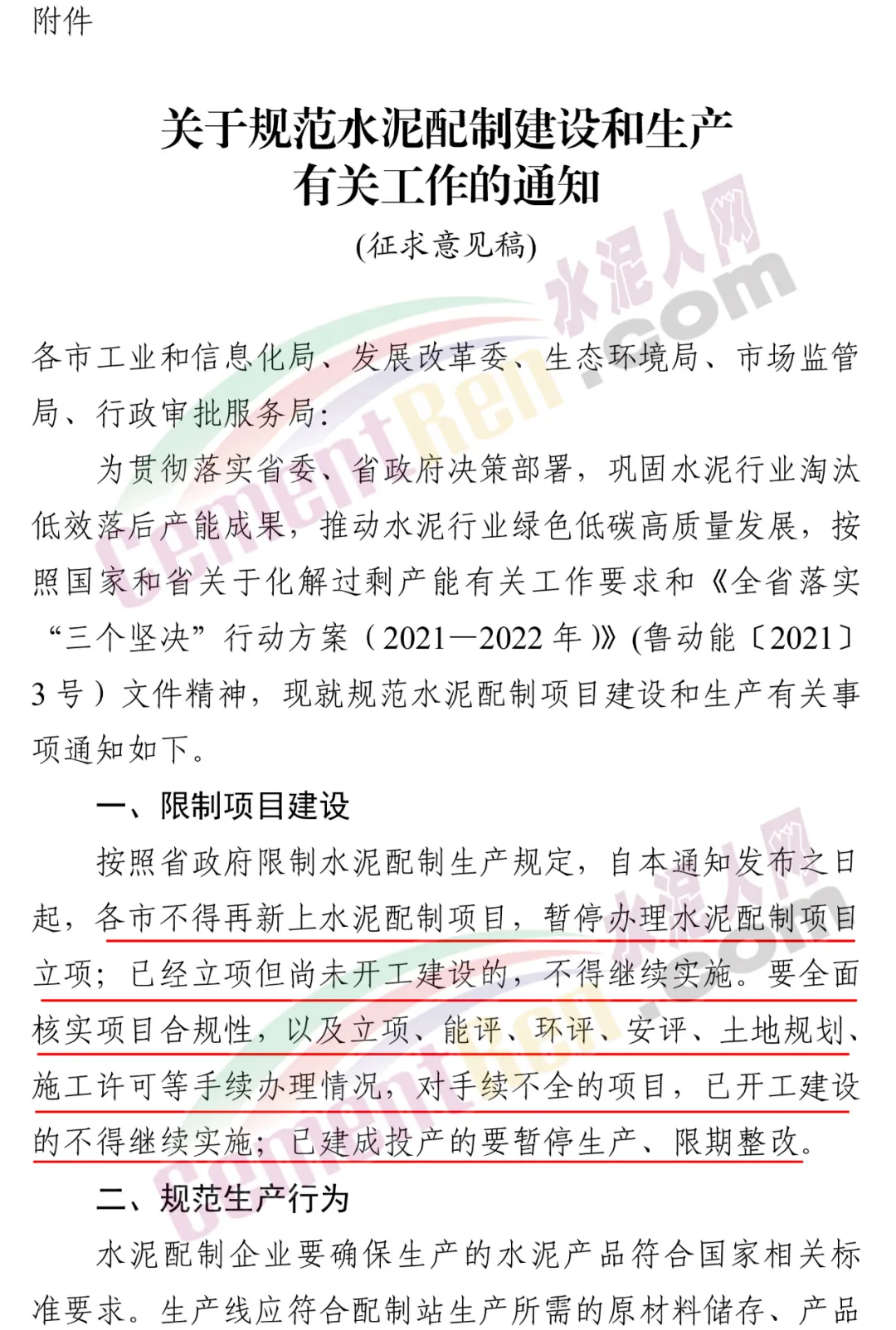 就此问题,通知指出,按照省政府限制水泥配制生产规定,自本通知发布之日起,山东省内各市不得再新上水泥配制项目,暂停办理水泥配制项目立项;已经立项但尚未开工建设的,不得继续实施。要全面核实项目合规性,以及立项、能评、环评、安评、土地规划、施工许可等手续办理情况,对手续不全的项目,已开工建设的不得继续实施;已建成投产的要暂停生产、限期整改。