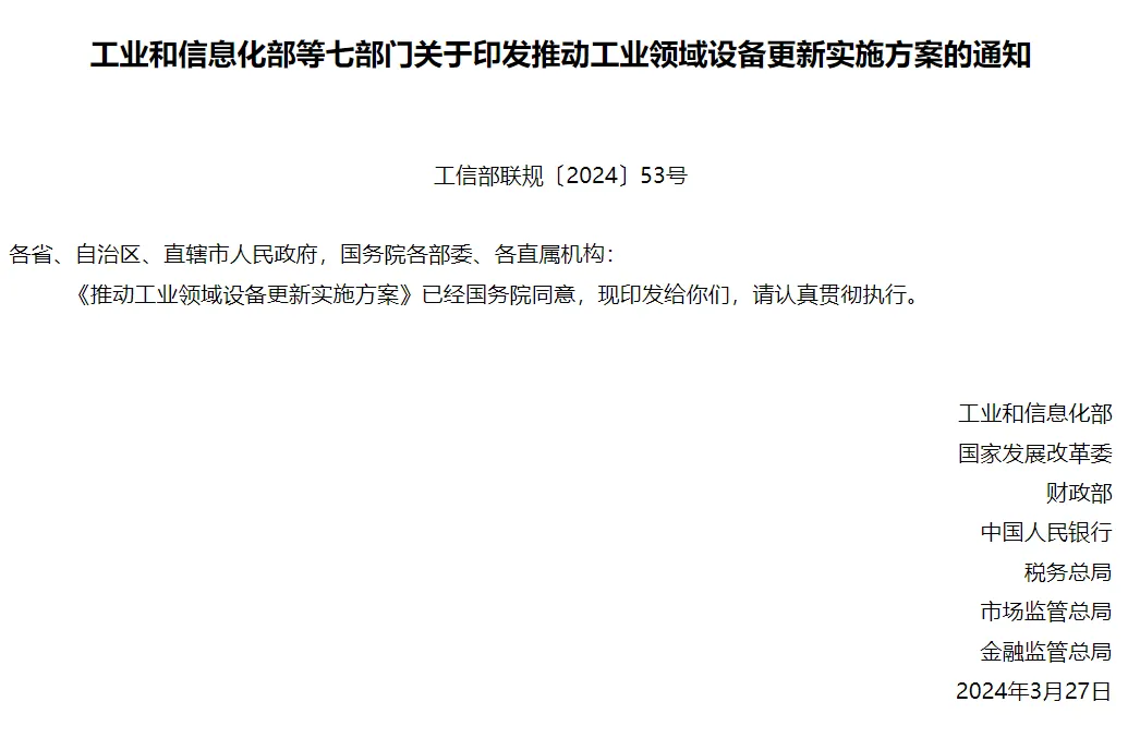 推动工业领域大规模设备更新,有利于扩大有效投资,有利于推动先进产能比重持续提升,对加快建设现代化产业体系具有重要意义。为贯彻落实党中央、国务院决策部署,推动工业领域设备更新和技术改造,制定如下实施方案。