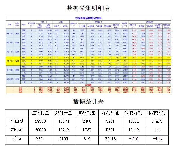 综上所述:吨熟料实物煤耗下降了2.6kg/吨熟料(空白期平均原煤单耗-加剂期原煤单耗);节约标煤耗下降4.5kg/吨熟料。