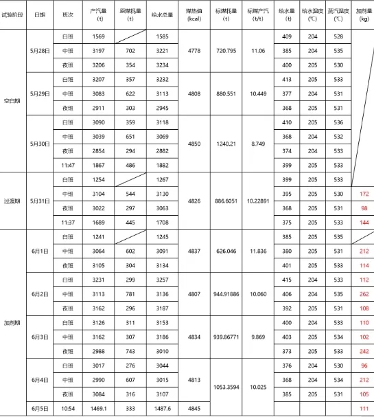 测试结论:在未使用燃煤催化剂期间,5月28日~5月30日标准煤产汽率为10.086吨/吨标煤;使用ZX-012燃煤催化剂期间,6月1日~6月4日标准煤产汽率为10.448吨/吨标煤,吨标煤产汽率提升3.6%。
