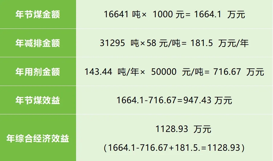 据“小朝”了解,一家化工有限公司预估全年煤炭消耗总量43万吨,按照节煤率3.87%计算,年节煤量为16641吨原煤,平均热值按5500kal/kg,全年减少二氧化碳排放量为31295吨/年,全年需消耗催化剂143.33吨,参照目前煤炭单价1000元/吨、燃煤催化剂50000元/吨。
