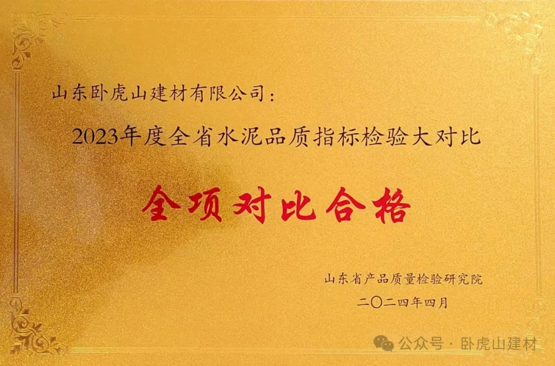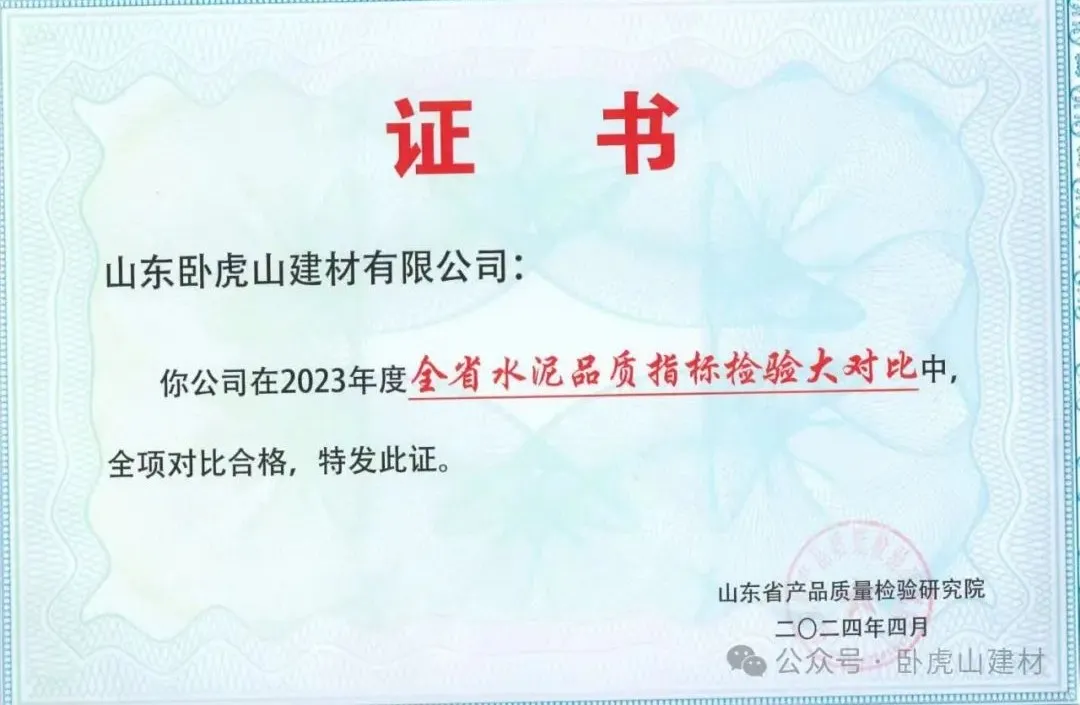 “2023年度全省水泥品质指标检验大对比全相对比合格”这一荣誉的获得,直接反映了山东卧虎山建材有限公司在产品品质控制上的严格与卓越。在水泥品质指标的大对比中实现全相对比合格,证明了其产品不仅符合国家及行业标准,而且在同行业中处于领先地位,这对于增强消费者信心、提升品牌形象具有重要意义。