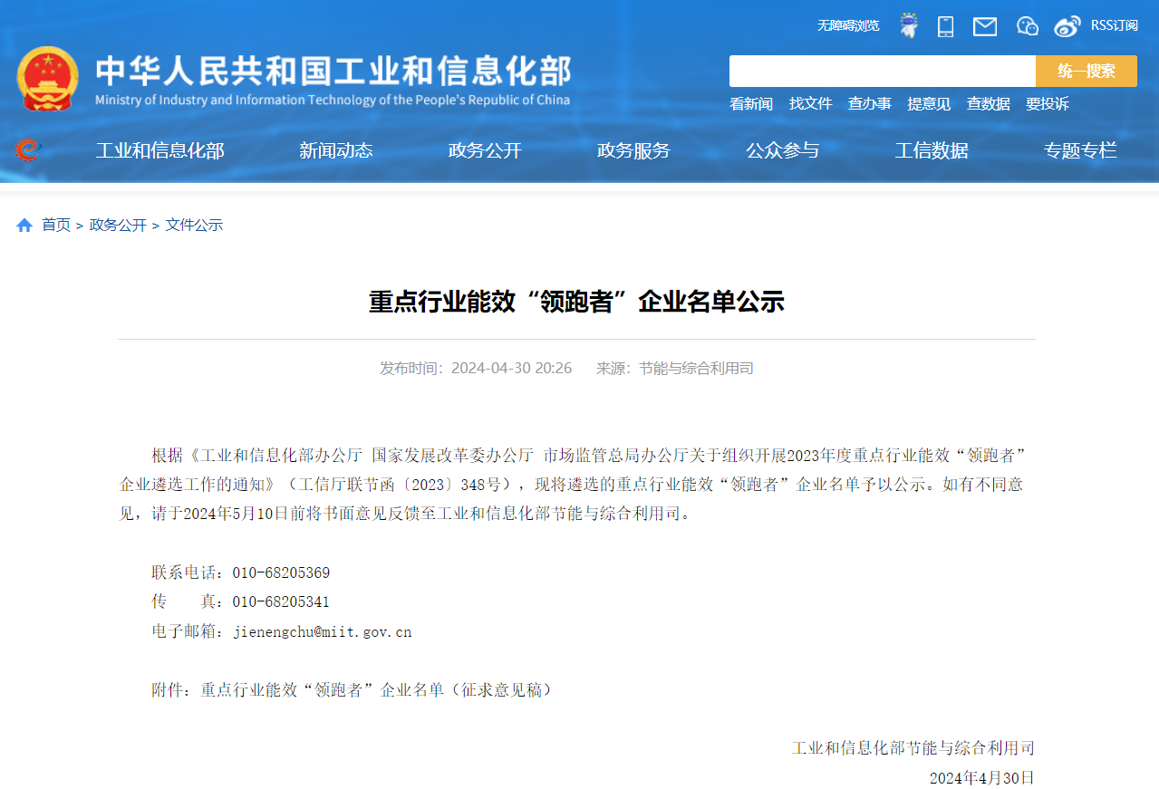 日前,工信部发布《重点行业能效“领跑者”企业名单公示》称,根据《工业和信息化部办公厅 国家发展改革委办公厅 市场监管总局办公厅关于组织开展2023年度重点行业能效“领跑者”企业遴选工作的通知》(工信厅联节函〔2023〕348号),现将遴选的重点行业能效“领跑者”企业名单予以公示。如有不同意见,请于2024年5月10日前将书面意见反馈至工业和信息化部节能与综合利用司。