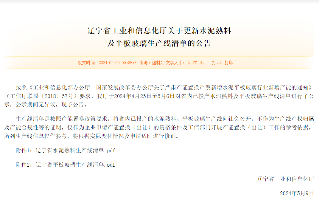 辽宁工信厅5月9日发关于更新水泥熟料及平板玻璃生产线清单的公告。截至2023年12月31日辽宁省水泥熟料生产线清单中共列出50条熟料生产线,涉及产能5032.8万吨/年。