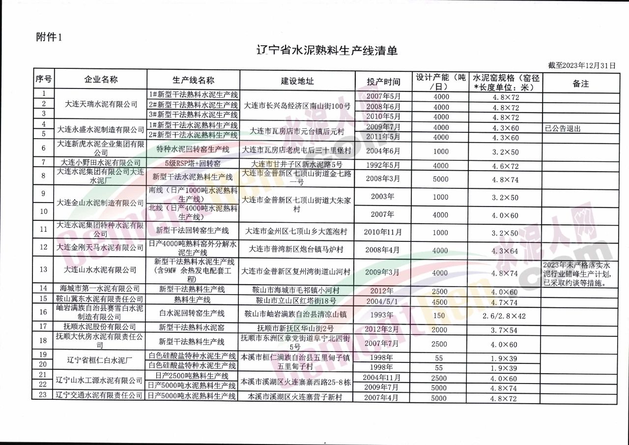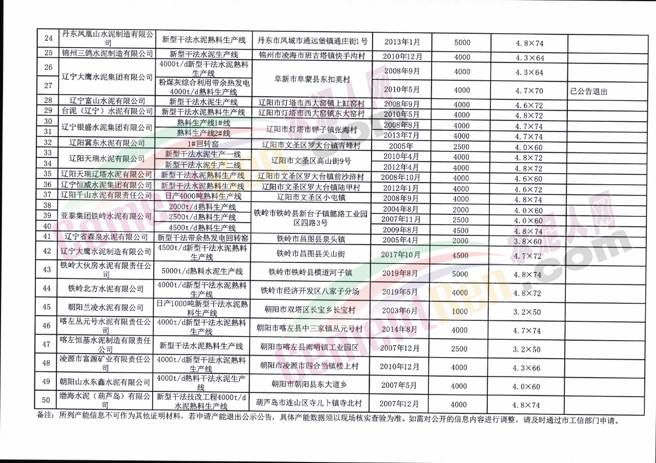 其中,大连永盛水泥制造有限公司2#4000t/d熟料生产线和辽宁大鹰水泥集团有限公司粉煤灰综合利用带余热发电4000t/d熟料生产线两条生产线已公告退出。