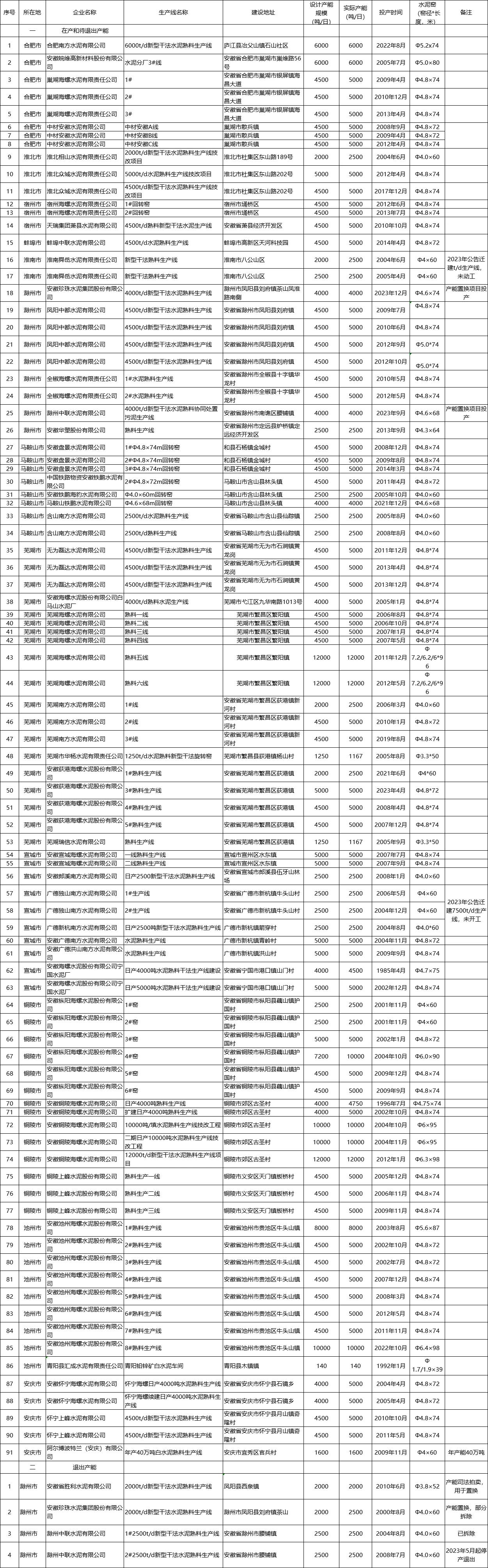 广德独山南方水泥有限公司2条2500t/d、广德新杭南方水泥有限公司1条2500t/d熟料线2023年公告迁建7500t/d生产线,未开工。