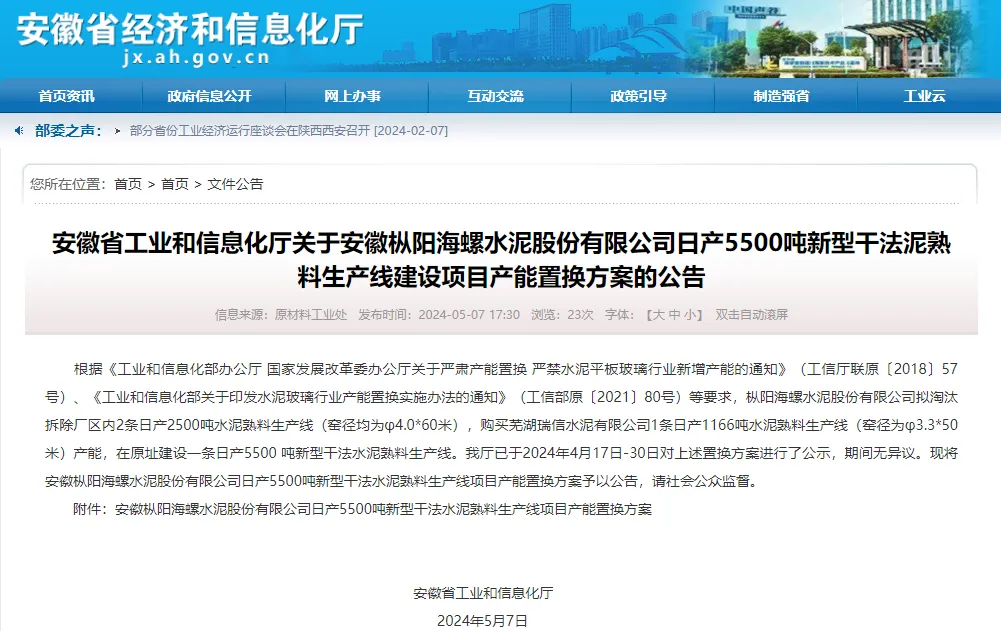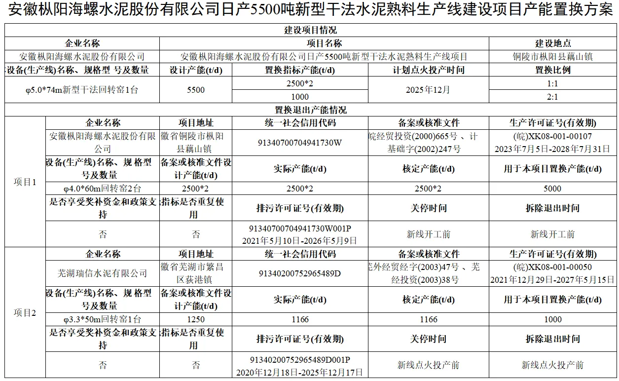 安徽省工信厅同期公布的还有海螺水泥一条5500t/d熟料生产线的产能置换方案公告。公告文件提到,根据相关文件要求,枞阳海螺水泥股份有限公司拟淘汰拆除厂区内2条日产2500吨水泥熟料生产线(窑径均为φ4.0*60米),购买芜湖瑞信水泥有限公司1条日产1166吨水泥熟料生产线(窑径为φ3.3*50米)产能,在原址建设一条日产5500 吨新型干法水泥熟料生产线。