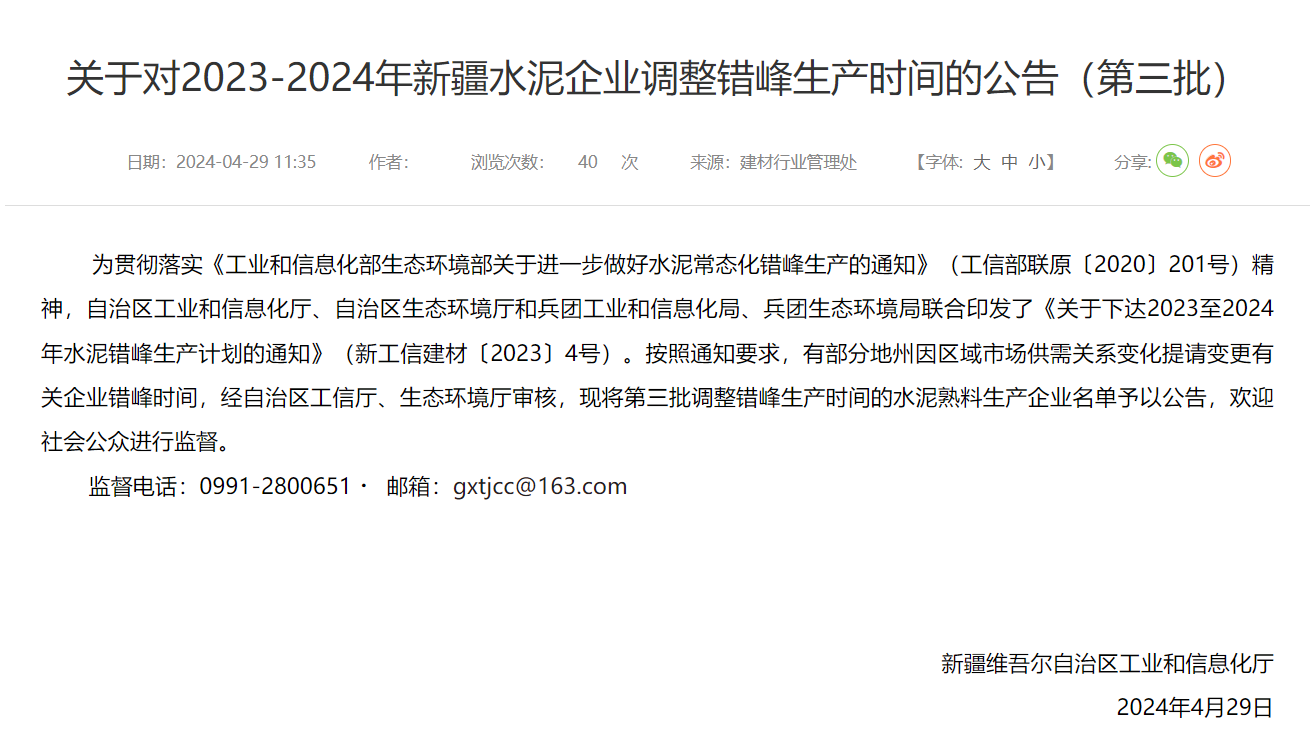 日前,新疆工信厅发布《关于对2023-2024年新疆水泥企业调整错峰生产时间的公告(第三批)》称,为贯彻落实相关文件要求,有部分地州因区域市场供需关系变化提请变更有关企业错峰时间,经自治区工信厅、生态环境厅审核,现将第三批调整错峰生产时间的水泥熟料生产企业名单予以公告,欢迎社会公众进行监督。