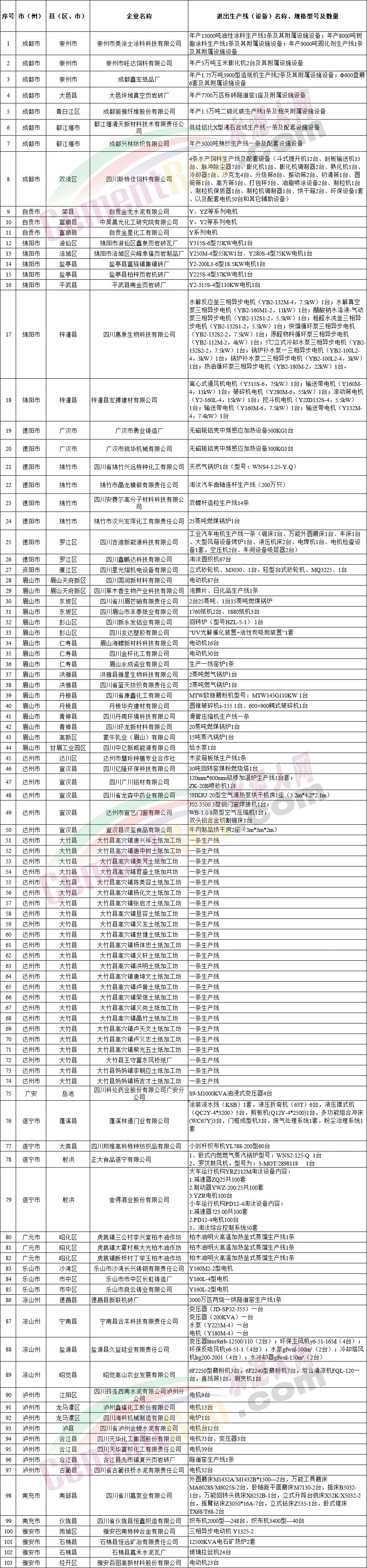 四川省2023年落后产能退出情况汇总表显示包含水泥行业自贡金龙水泥有限公司、四川省泸州金蝉水泥有限公司、四川省古蔺铁桥水泥有限责任公司等在内的100多家企业均存在相关退出生产线及设备。