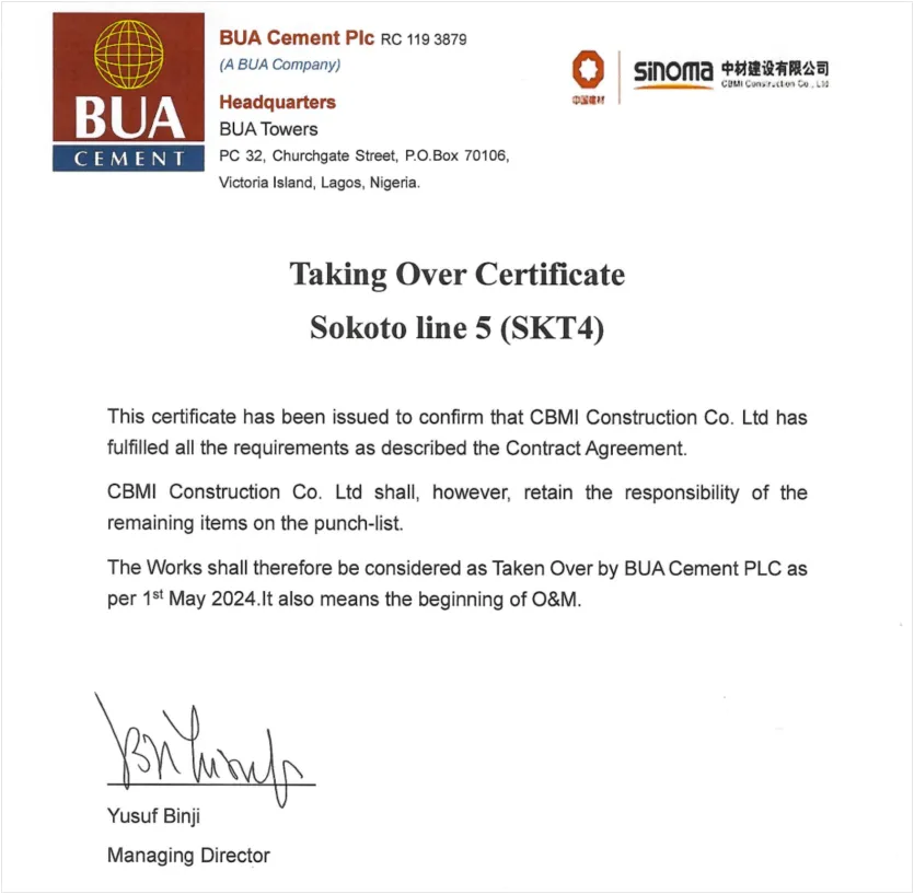 2024年5月1日,尼日利亚SOKOTO4项目6000TPD熟料水泥生产线成功获得业主BUA水泥集团签发的TOC证书。TOC证书的签发标志着SOKOTO4项目EPC总承包成功履约,项目执行画上圆满句号,生产线正式移交业主并转入生产运营。