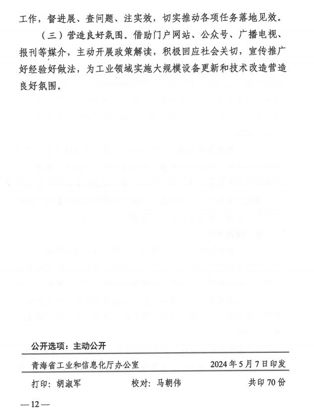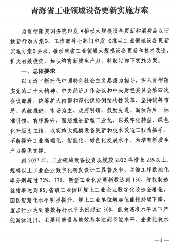 日前,青海省工业和信息化厅等七部门关于印发青海省工业领域设备更新实施方案的通知。