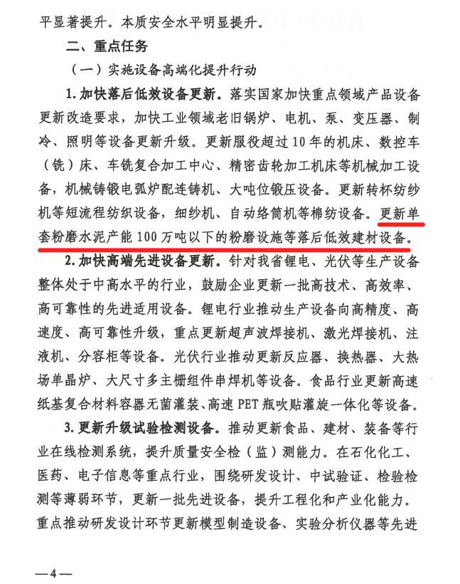 青海省工业领域设备更新实施方案中提到,加快落后低效设备更新,更新单套粉磨水泥产能100万吨以下的粉磨设施等落后低效建材设备。