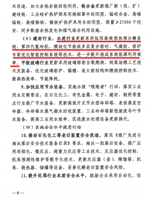 实施绿色化转型提标行动。水泥行业更新采用低阻高效预热预分解系统、第四代篦冷机、模块化节能或多层复合窑衬、气凝胶、窑炉专家优化智能控制系统等技术,进一步提升烧成系统能源利用效率。