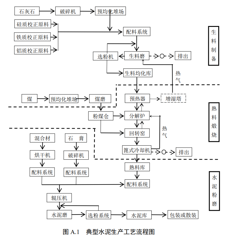 A.1.1 主要生产工艺:破碎、配料、回转窑煅烧、烘干、水泥粉磨、水泥制品加工等。