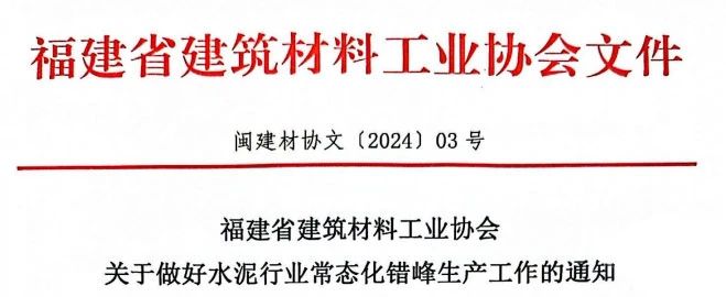 日前,福建省建筑材料工业协会发布《关于做好水泥行业常态化错峰生产工作的通知》要求,福建省内所有水泥熟料生产线(不论目标市场为何地)均须参与错峰生产。