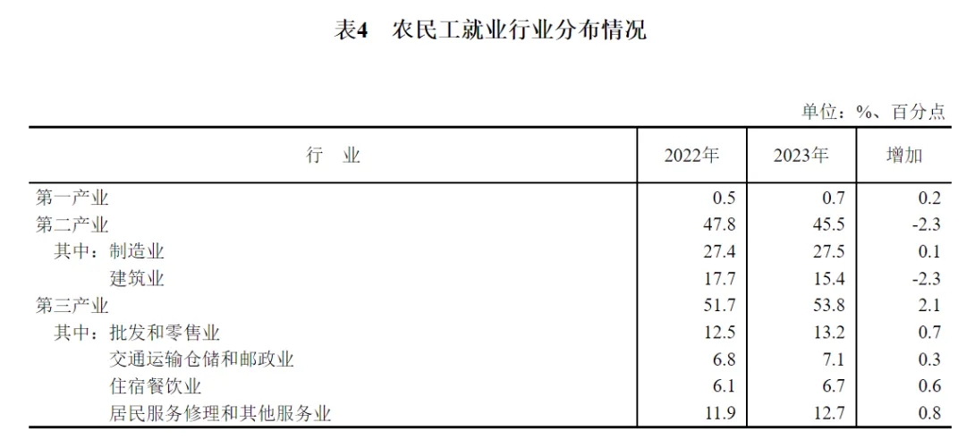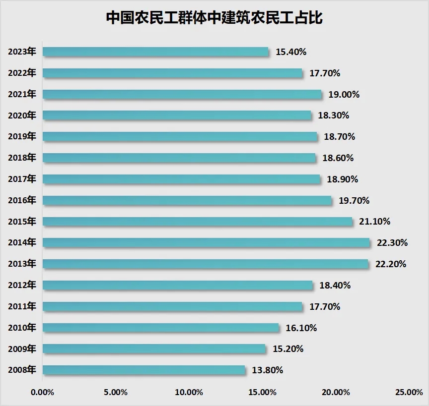据国家统计局数据,2023年和2022年农民工就业行业分布情况显示,2023年在建筑业就业的人占比为15.4%,而2022年为17.7%。