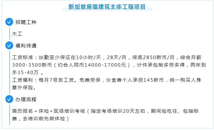 此前一家新加坡房屋建筑主体工程项目招聘木工,招聘启事显示,综合月薪3000-3500新币,折合约人民币14000~17000元,月入过万。