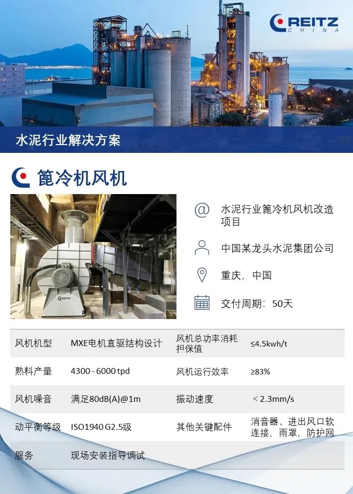 锐志风机凭借优秀的技术设计和精湛的制造工艺,帮助该客户(中国北方最大的水泥生产商和供应商)在篦冷机风机改造项目中,顺利实现: