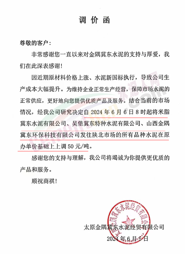 太原金隅冀东水泥经贸公司通知,因近期原材料价格上涨、水泥新国标执行,导致公司生产成本大幅提升。为维持企业正常生产经营,保障市场水泥的正常供应,结合当前的市场情况,经公司研究决定自2024年6月6日8时起将米脂冀东水泥有限公司、吴堡冀东特种水泥有限公司、山西金隅冀东环保科技有限公司发往陕北市场的所有品种水泥在原办单价基础上上调50元/吨。