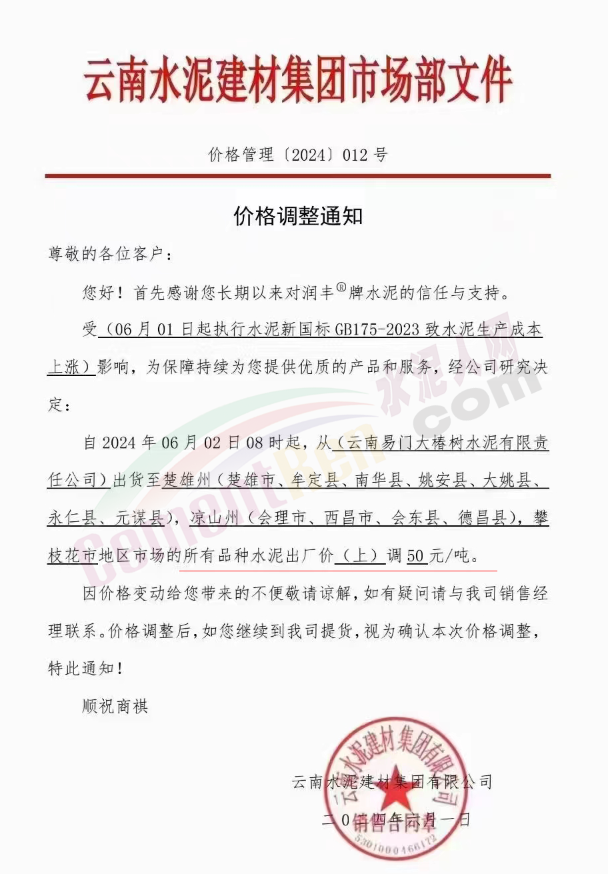 甘肃祁连山陇南公司通知,因2024年6月1日起,水泥新标准GB175-2023正式实施,造成水泥成本上升。考虑目前的市场需求和库存情况,经公司研究决定,自2024年6月4日零时起,对文县祁连山水泥有限公司阿坝州地区的各品种袋装水泥价格上调30元/吨,散装水泥价格上调50元/吨。