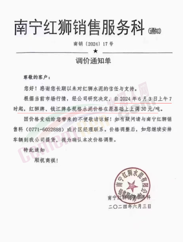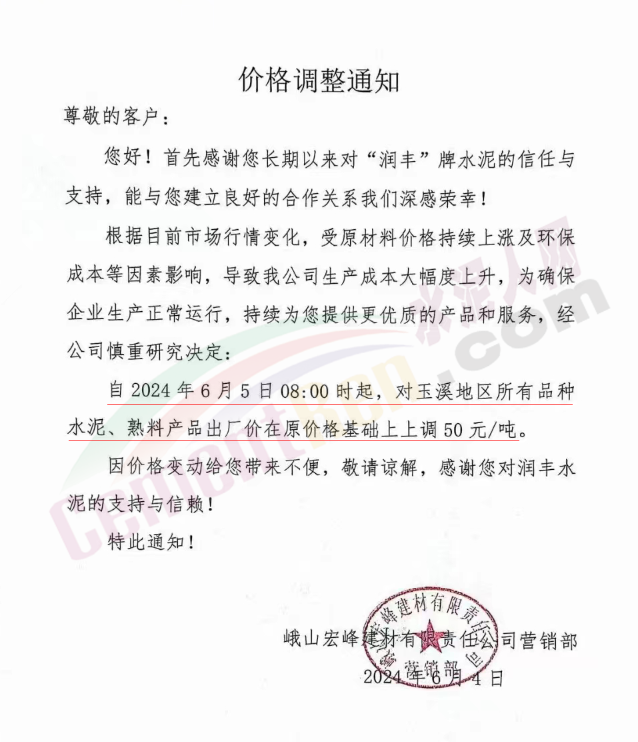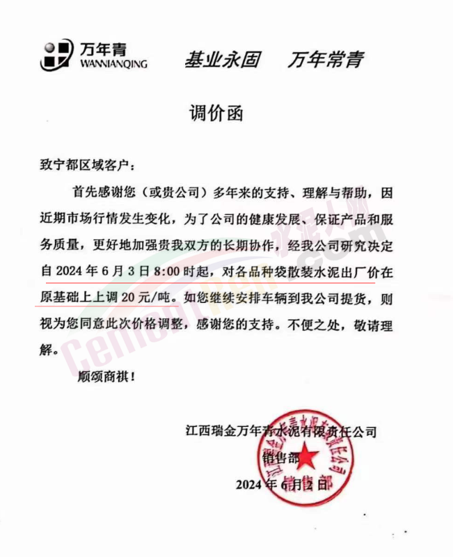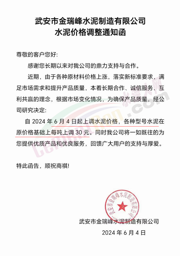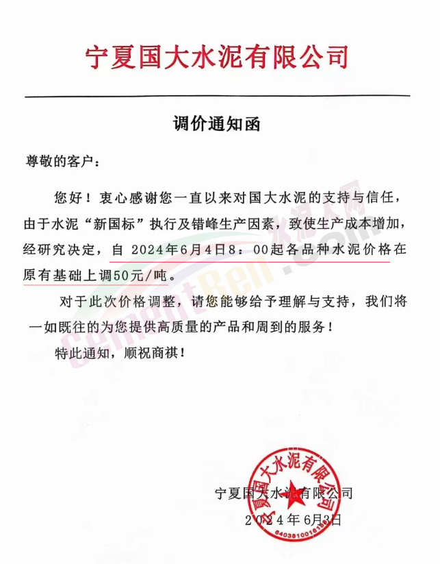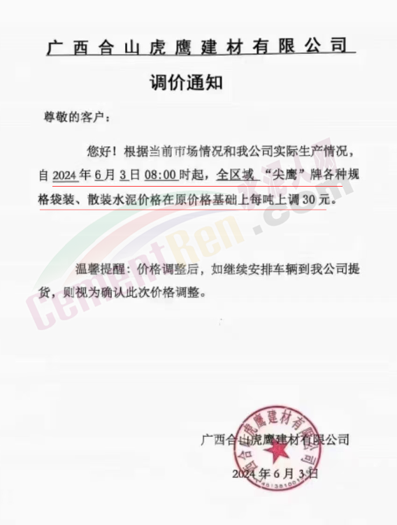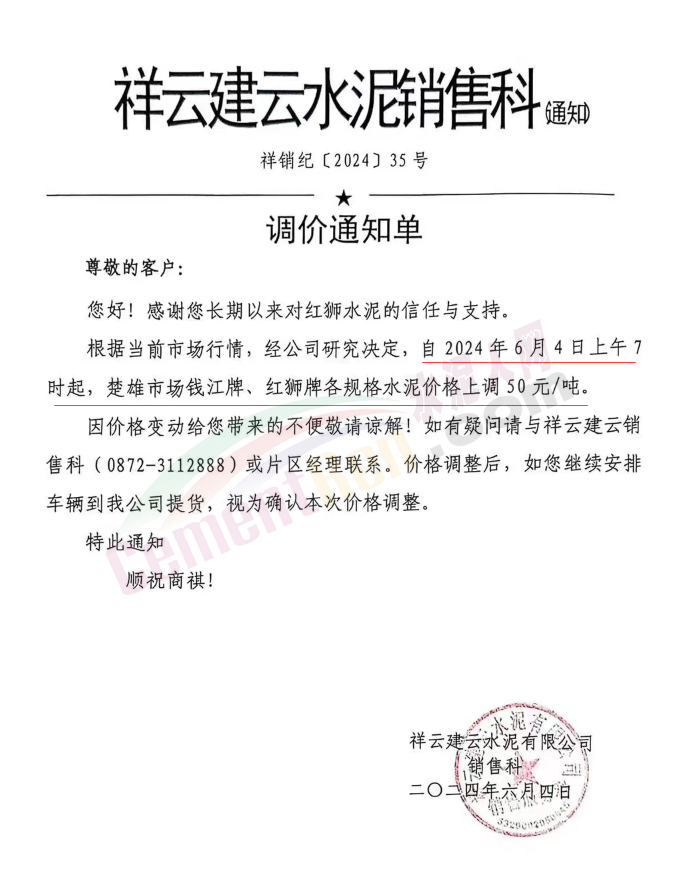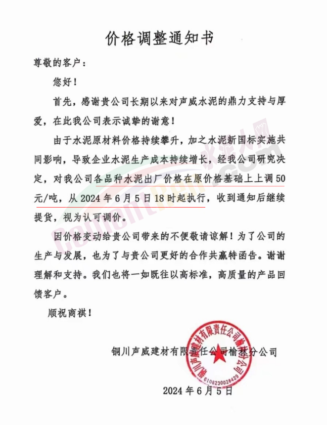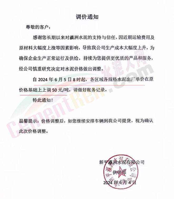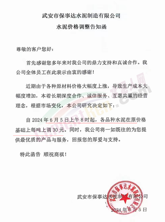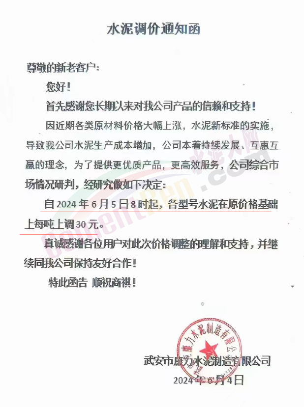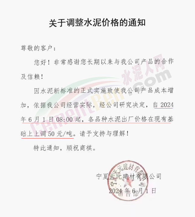 内蒙古自治区乌审旗力威建材有限责任公司通知,因通用硅酸盐水泥新标准GB175-2023于2024年6月1日起正式实施,致水泥生产成本大幅上涨,加之全国环保管控升级错峰生产因素影响,为保障公司正常生产运行,继续为客户提供优质产品与服务。经公司研究决定,自2024年6月6日12时起,对公司全品种水泥出厂价格上调50元/吨。