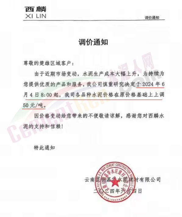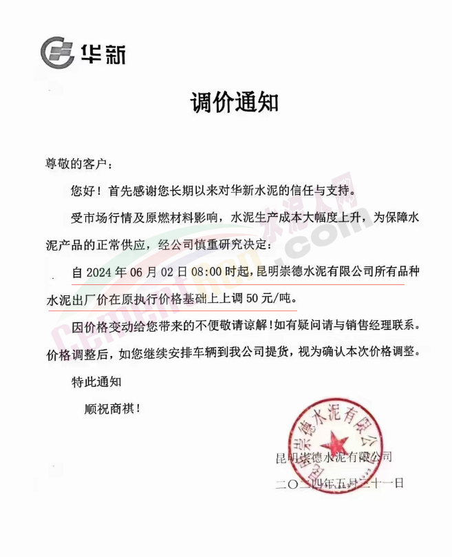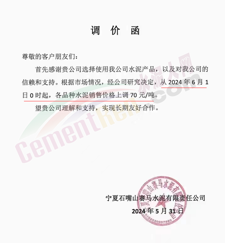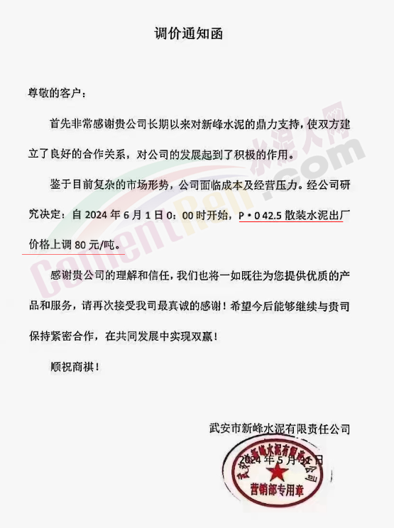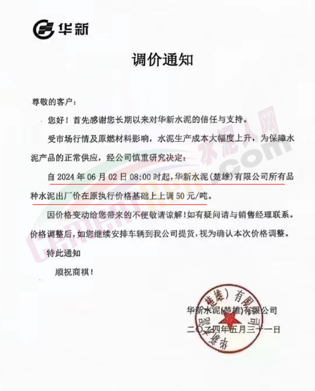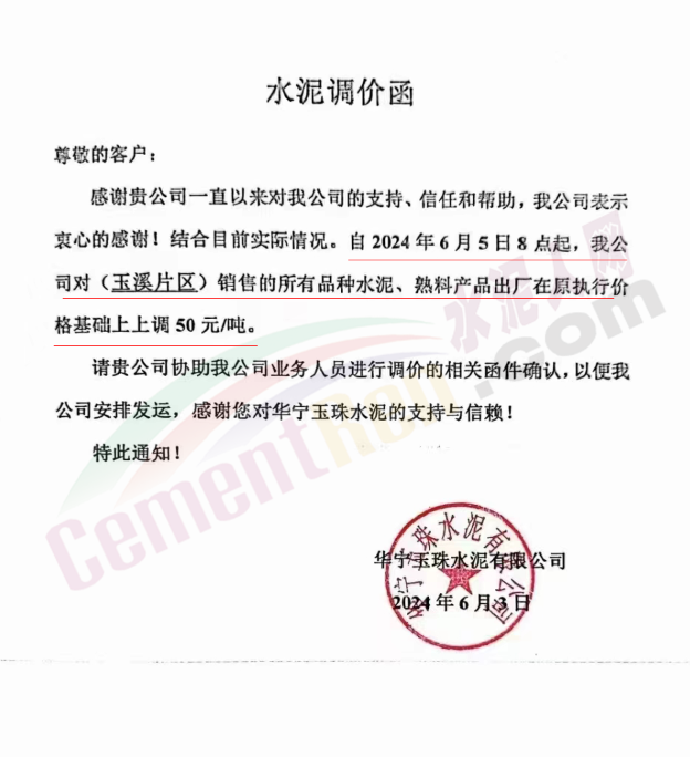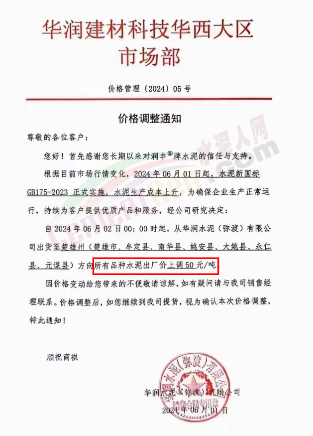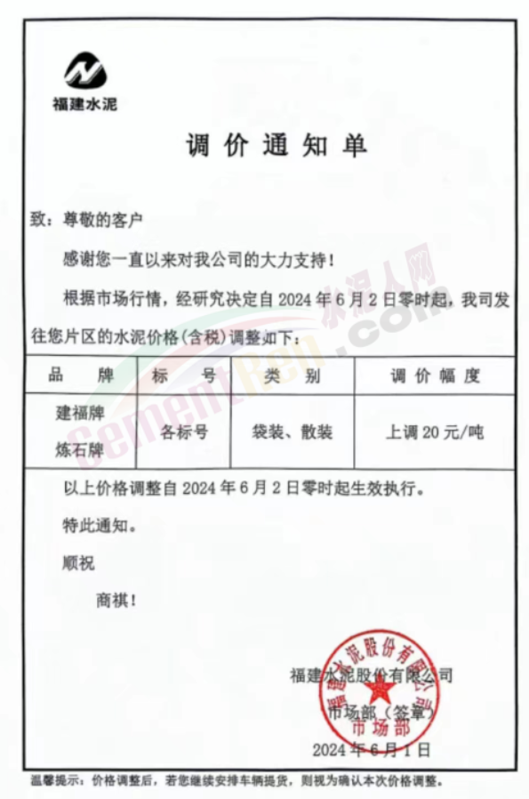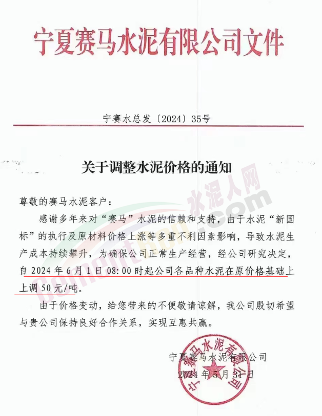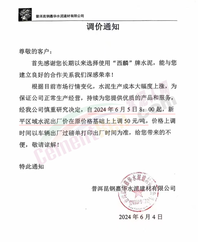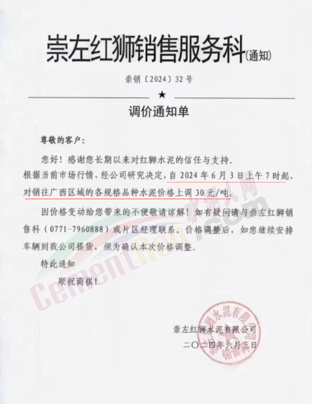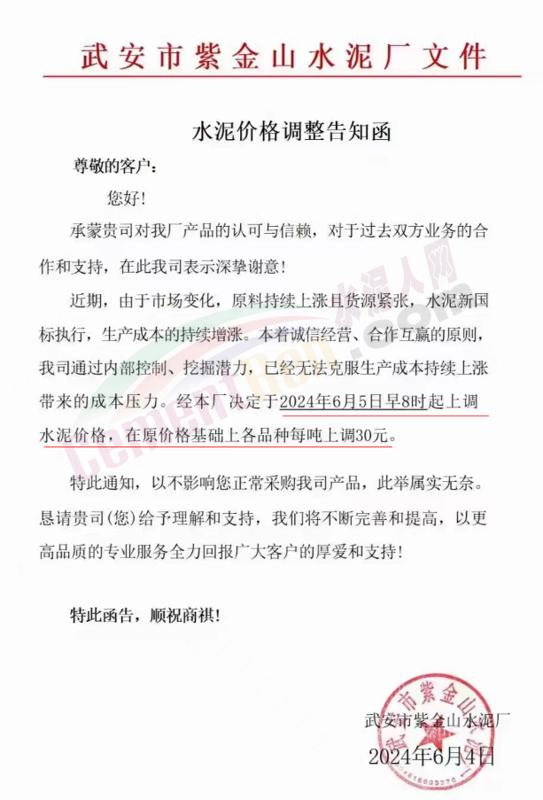 内蒙古自治区乌审旗力威建材有限责任公司通知,因通用硅酸盐水泥新标准GB175-2023于2024年6月1日起正式实施,致水泥生产成本大幅上涨,加之全国环保管控升级错峰生产因素影响,为保障公司正常生产运行,继续为客户提供优质产品与服务。经公司研究决定,自2024年6月6日12时起,对公司全品种水泥出厂价格上调50元/吨。